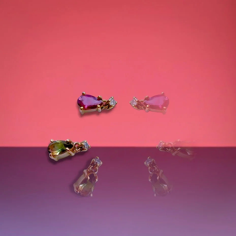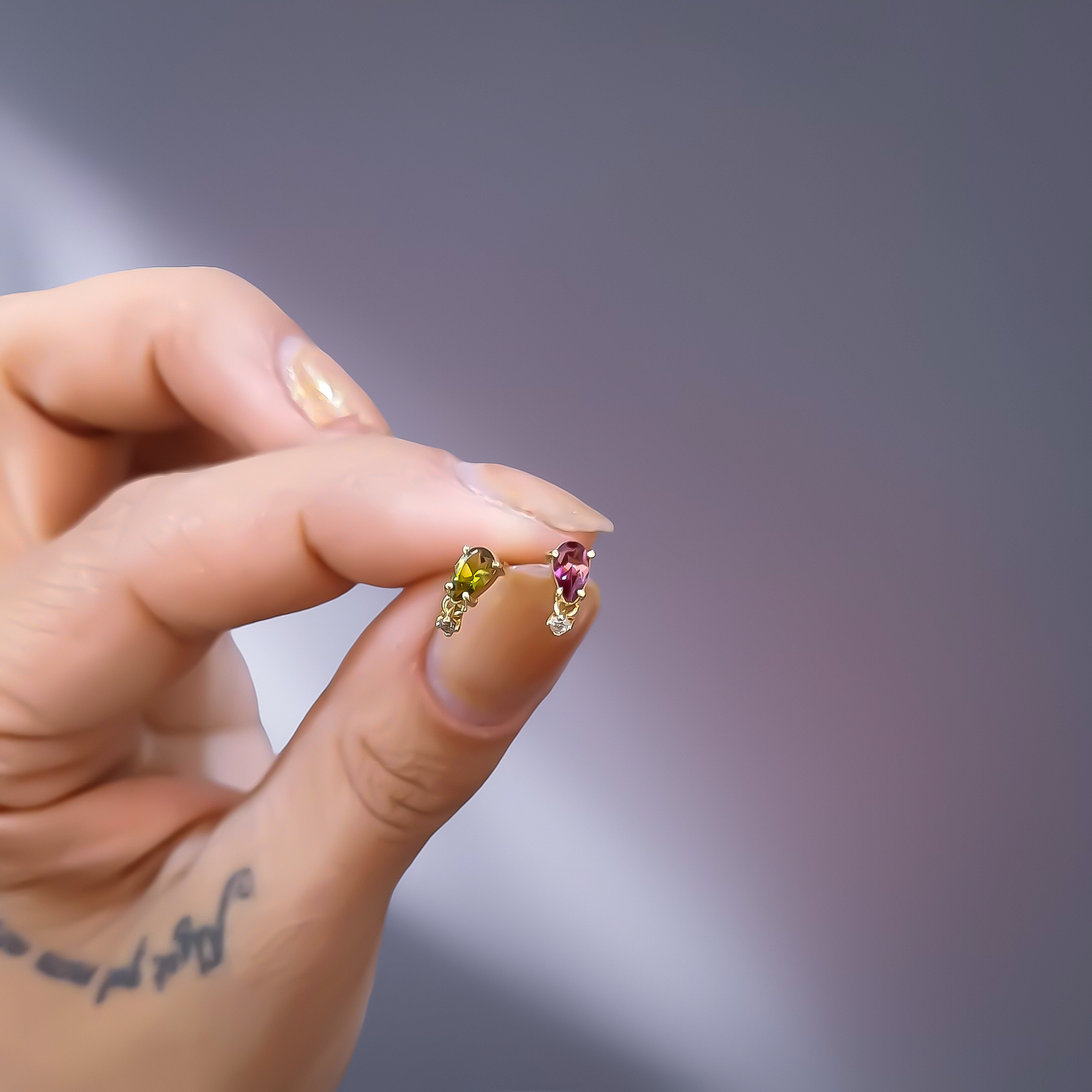 The perfect fine, everyday stud (1 piece). An eye catcher premium tourmaline drop set in 14KYG with a dangling daimond for some spark. Use it single or in pair.