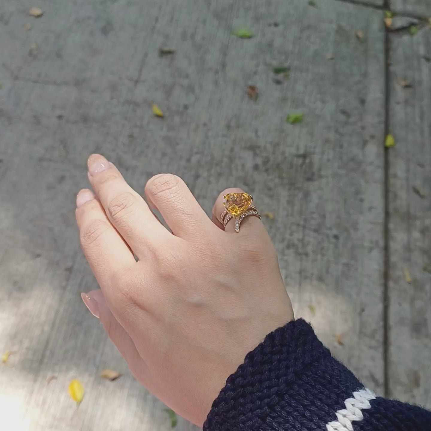 Está elaborado en oro amarillo reciclado de 14k, con un citrino natural en corte corazón, rodeado por un espiral de aproximadamente 0.73 quilates de diamantes de laboratorio Premium.