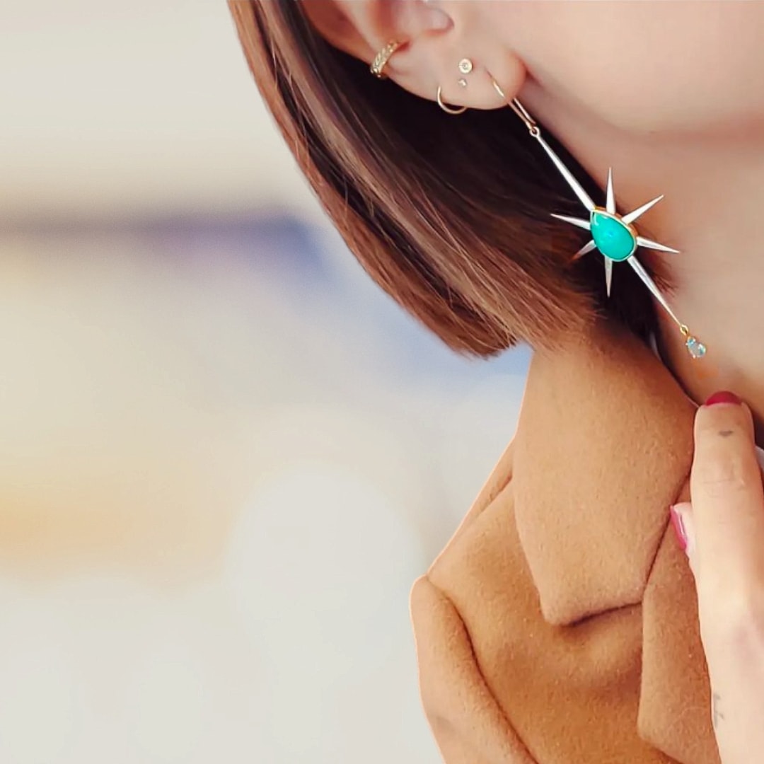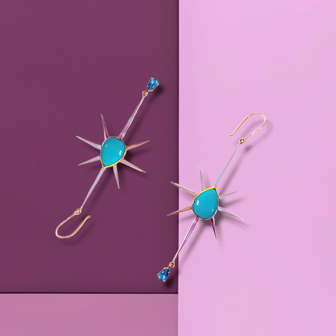 Long earrings handcrafted in precious Mexican Silver and recycled 14KYG. They feature fine drop turquoises of imposible blue and blue apatites.